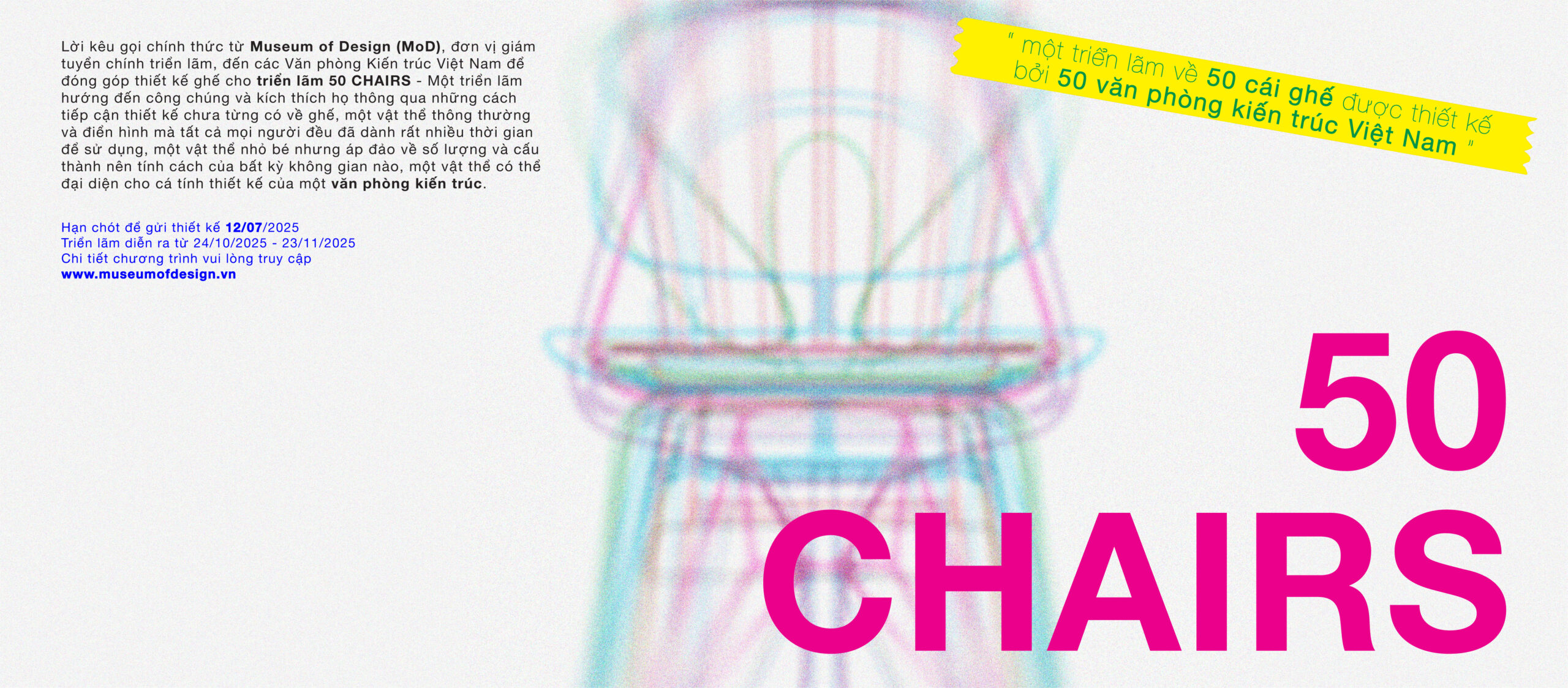 Đây là một lời kêu gọi chính thức từ Museum of Design (MoD), đơn vị giám tuyển chính của triển lãm, đến các Văn phòng Kiến trúc Việt Nam để đóng góp thiết kế ghế cho triển lãm 50 CHAIRS. Đây là một triển lãm hướng đến công chúng và kích thích họ thông qua những cách tiếp cận thiết kế chưa từng được dẫn chứng về ghế, một vật thể thông thường và điển hình mà tất cả mọi người đều đã dành rất nhiều thời gian để sử dụng trực tiếp nó, một vật thể nhỏ bé nhưng áp đảo về số lượng cấu thành nên tính cách của bất kỳ không gian nào, một vật thể có thể đại diện cho cả một cá tính thiết kế của một văn phòng kiến trúc.